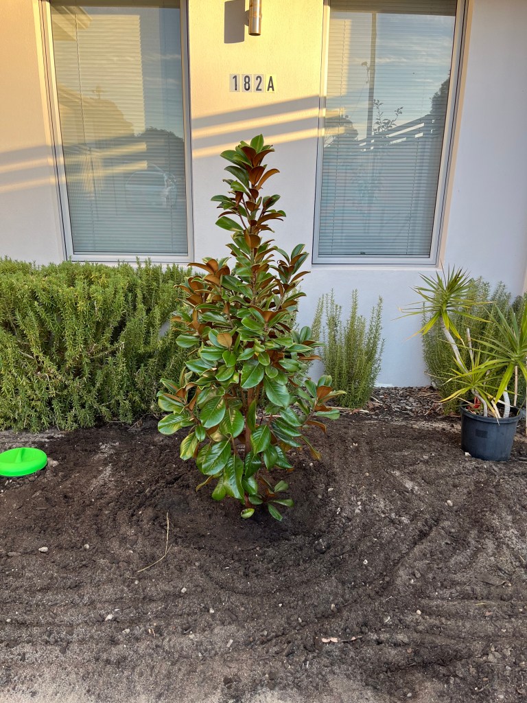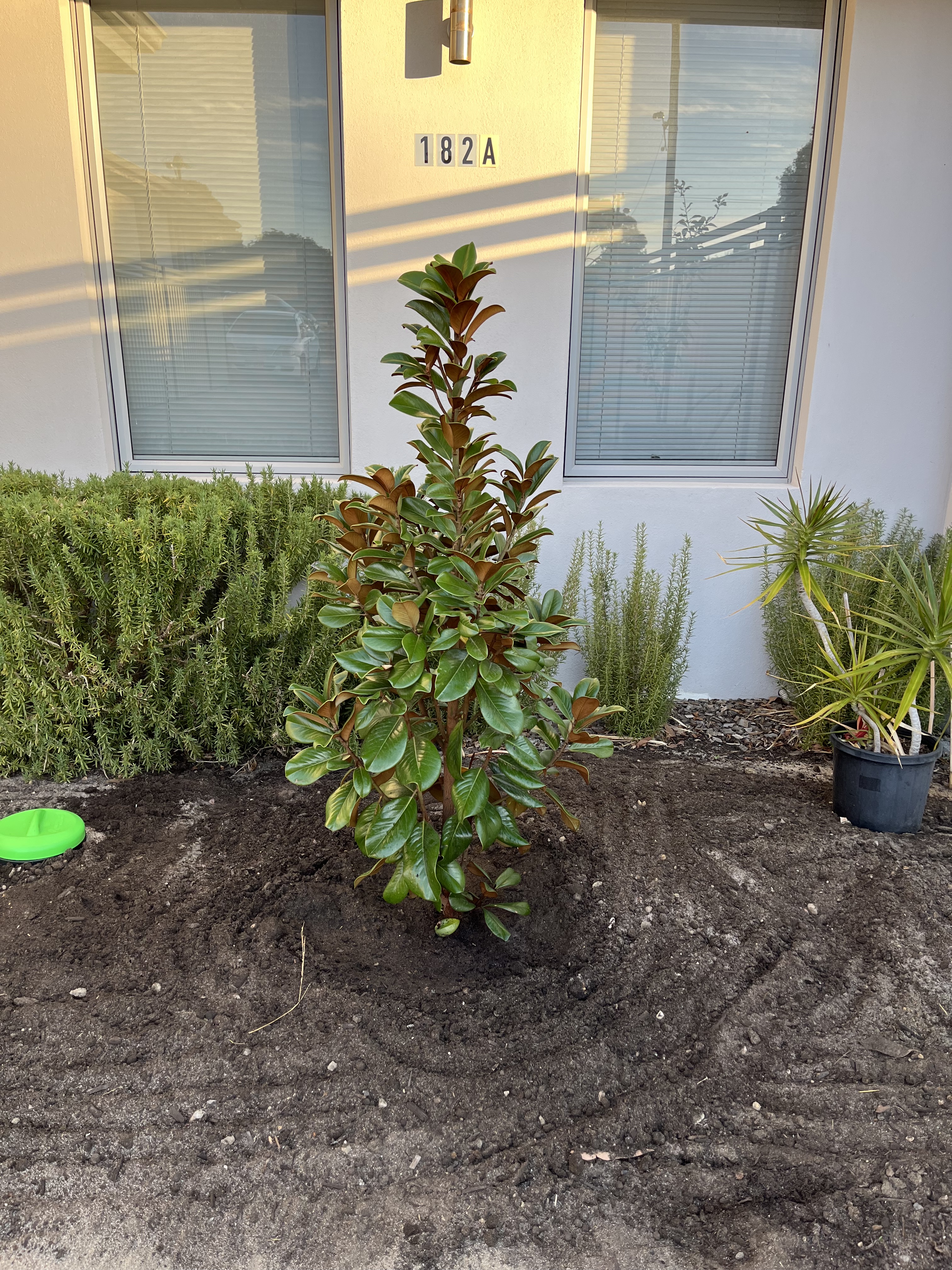 Aunty Peta (and I) decided on a magnolia tree to be the centre piece of the garden. It took a lot of time, effort and money on her part but she finally settled on a lovely little Teddy Bear magnolia which is a dwarf variety and should suit the location well. Aunty Peta dropped it off whilst I was at work one day. Thanks Aunty Pete!